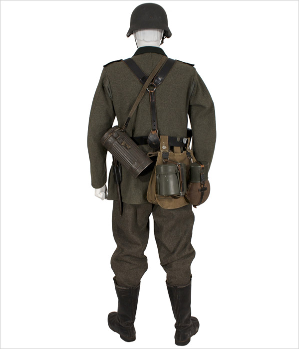 FIELD GEAR: Leather Y Straps, EM Leather Belt w/ SS EM Buckle, K-98 Leather Rifle Ammunition Pouches (one pair), K-98 Bayonet w/ leather frog, Bread Bag, Canteen and Cup w/ strap, Mess tin w/ leather Tournister strap, Gas Mask Canister w/ web shoulder strap.