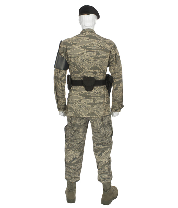INSIGNIA: sewn-on USAF service and Airman’s name tapes, Security Police badge and brassard.